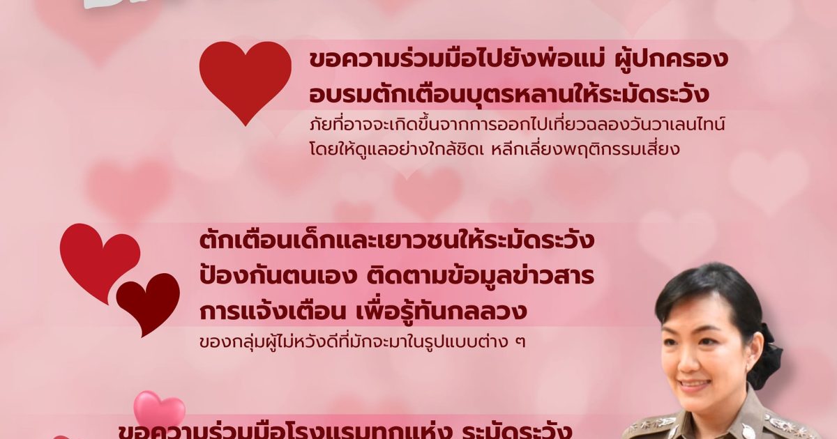 ผบ.ตร.กำชับตำรวจทั่วประเทศวาเลนไทน์นี้ ดูแลเด็กเยาวชนป้องกันภัยทางเพศ – ทะเลาะวิวาท สั่งการ 3 เข้ม จุดตรวจ จุดเสี่ยง คุมสถานบริการ สถานบันเทิง โรงแรม การจำหน่ายสุรา ตร.ขอความร่วมมือผู้ปกครองอบรมดูแลบุตรหลาน