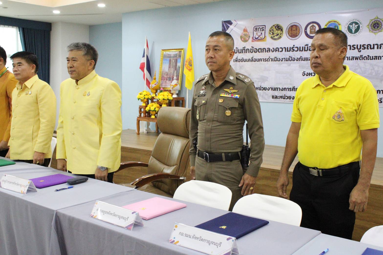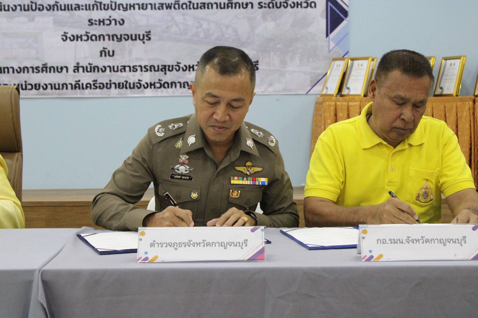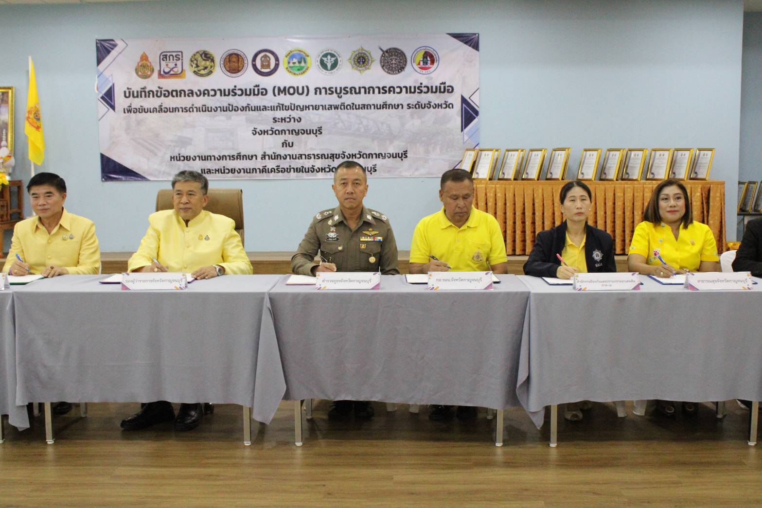 ร่วมบันทึกข้อตกลงความร่วมมือ MOU การบูรณาการความร่วมมือ เพื่อขับเคลื่อนการดำเนินงานป้องกันและแก้ไขปัญหายาเสพติดในสถานศึกษา ระดับจังหวัด ระหว่างกาญจนบุรีกับหน่วยงานทางการศึกษา สำนักงานสาธารณสุขจังหวัดกาญจนบุรี และหน่วยงานภาคีเครือข่ายในจังหวัดกาญจนบุรี กิจกรรมการสร้างการรับรู้และรณรงค์การป้องกันและเฝ้าระวังยาเสพติดในสถานศึกษา เนื่องในวันต่อต้านยาเสพติดโลก