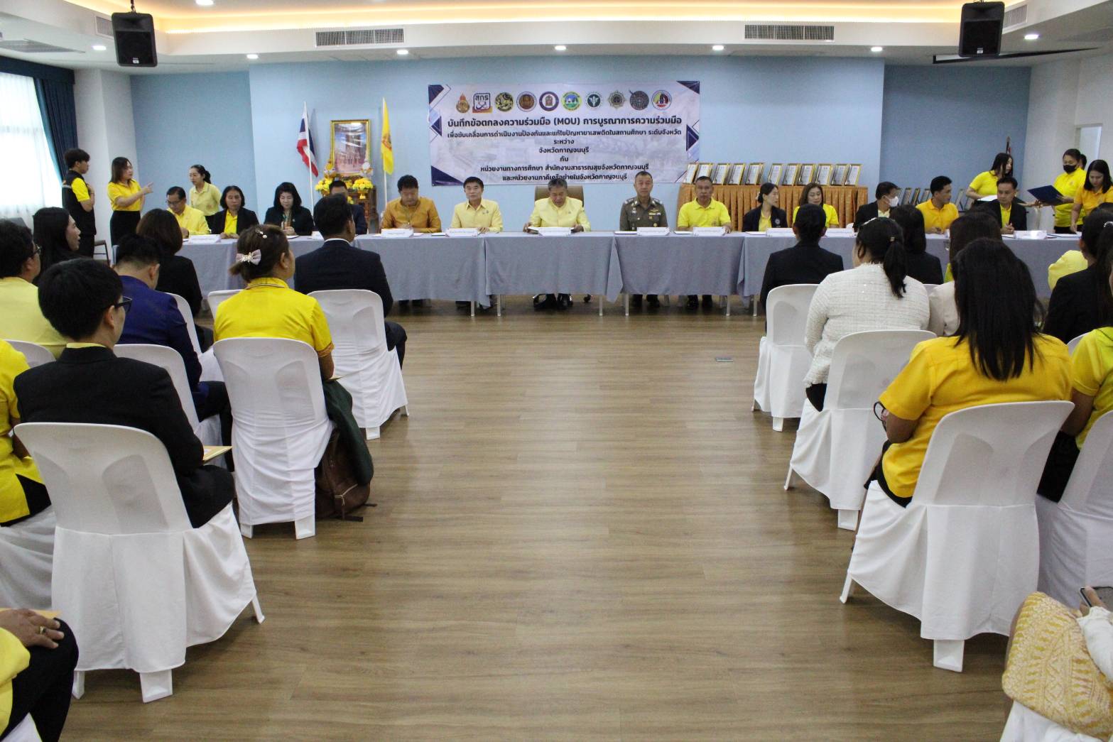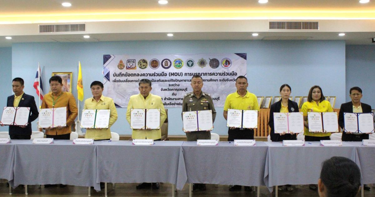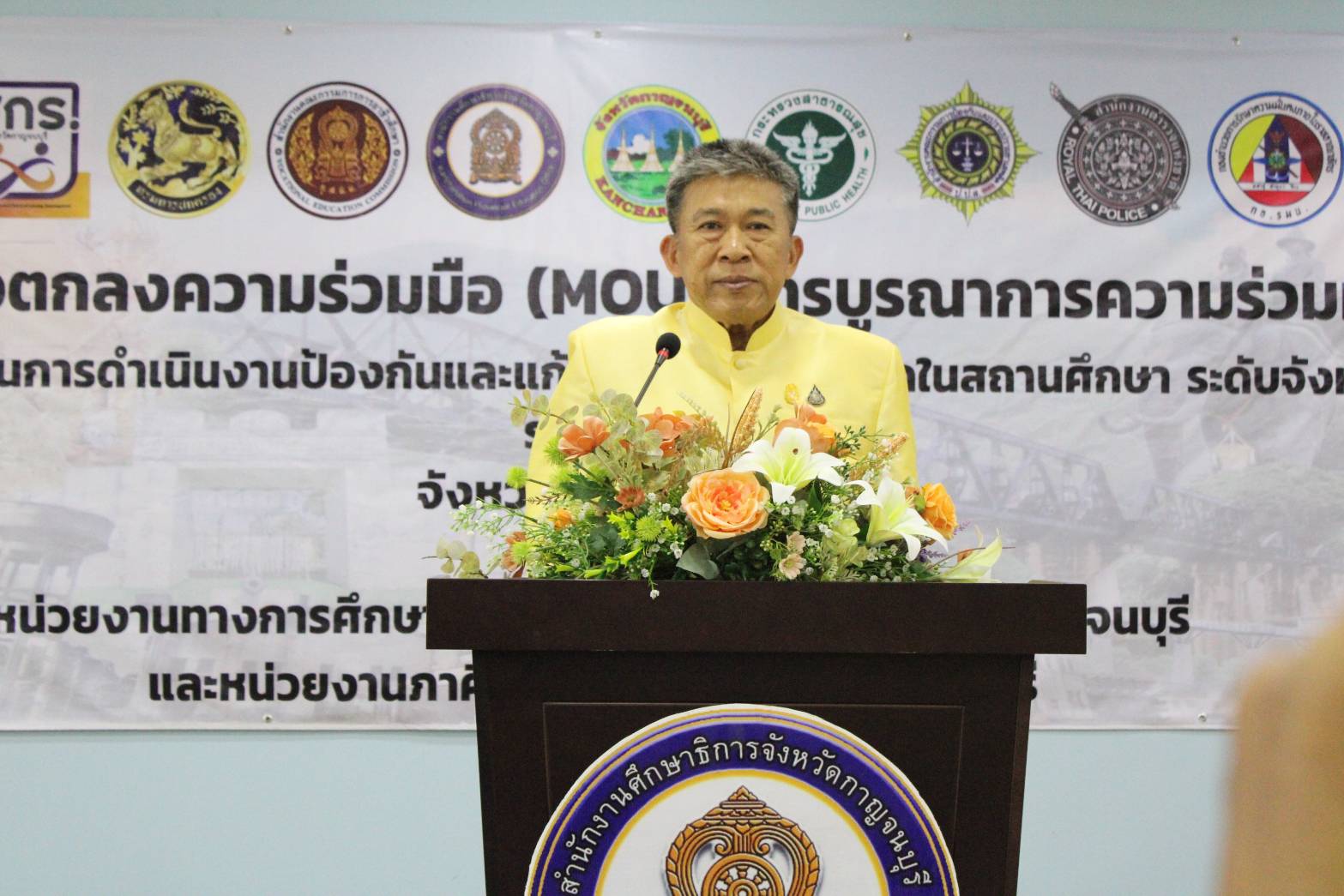ร่วมบันทึกข้อตกลงความร่วมมือ MOU การบูรณาการความร่วมมือ เพื่อขับเคลื่อนการดำเนินงานป้องกันและแก้ไขปัญหายาเสพติดในสถานศึกษา ระดับจังหวัด ระหว่างกาญจนบุรีกับหน่วยงานทางการศึกษา สำนักงานสาธารณสุขจังหวัดกาญจนบุรี และหน่วยงานภาคีเครือข่ายในจังหวัดกาญจนบุรี กิจกรรมการสร้างการรับรู้และรณรงค์การป้องกันและเฝ้าระวังยาเสพติดในสถานศึกษา เนื่องในวันต่อต้านยาเสพติดโลก