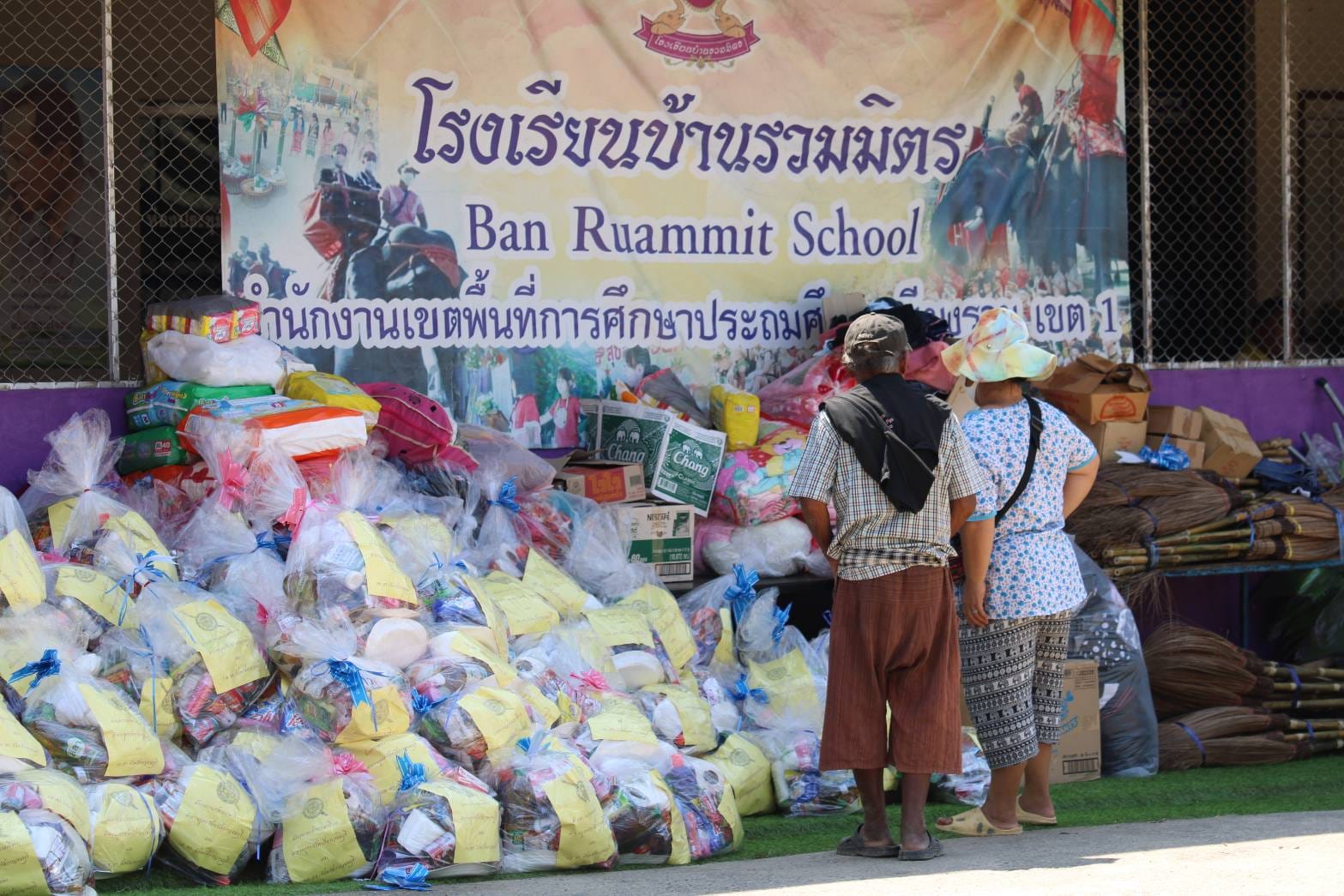 นำสิ่งของอุปโภคบริโภค มอบให้กับผู้ประสบภัยน้ำท่วมดินโคลนถล่ม ตามโครงการ “ปันน้ำใจผู้ประสบภัยน้ำท่วม โดยตำรวจภูธรจังหวัดกาญจนบุรี ร่วมกับ กต.ตร. จังหวัดกาญจนบุรี ” นำมามอบให้กับทางโรงเรียนและชาวบ้านหมู่บ้านรวมมิตร ที่ถูกผลกระทบจากอุทกภัยน้ำท่วมดินโคลนถล่ม