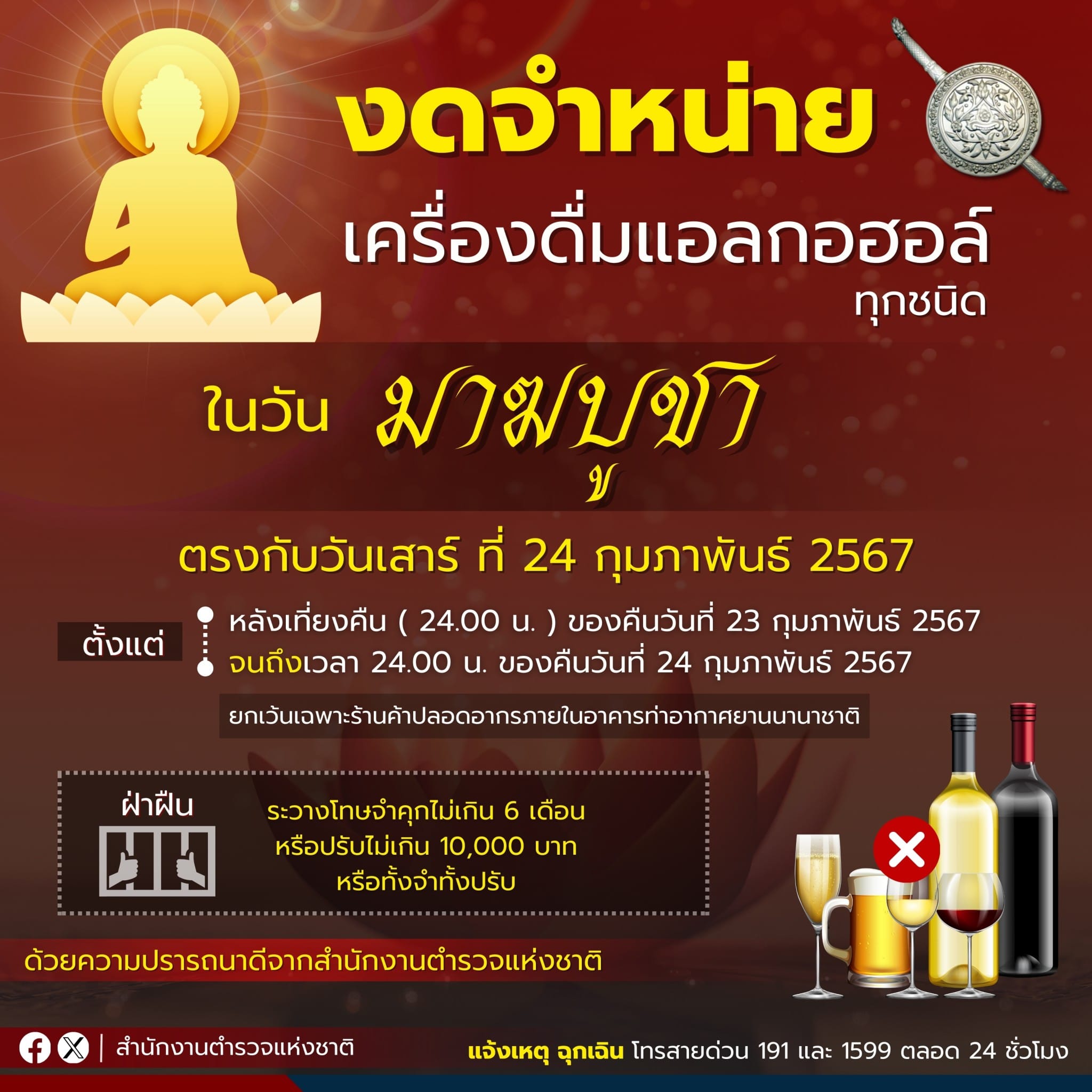 สำนักงานตำรวจแห่งชาติเตือนงดจำหน่ายเครื่องดื่มแอลกอฮอล์ เนื่องในวันมาฆบูชา ประจำปี 2567 ทุกช่องทาง ด